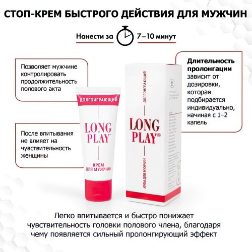 Long Play обладает сильным пролонгирующим эффектом, активно понижая чувствительность головки пениса и увеличивая длительность полового акта.