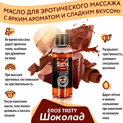 Масло Eros Tasty придаст любовным играм дополнительной пикантности. Его приятный шоколадный аромат окутает облаком сладости и неги.
