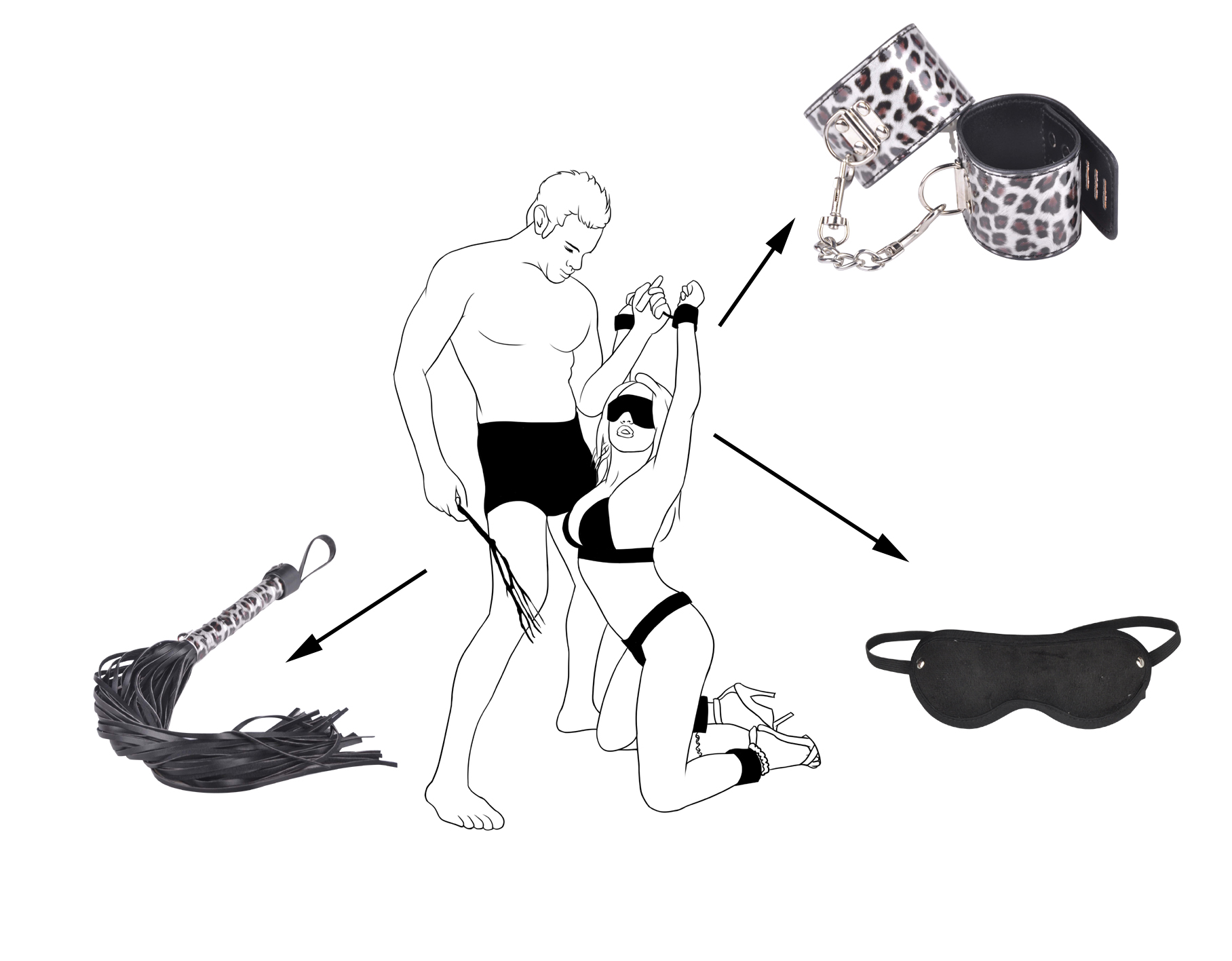 Комплектация: наручники, поножи, ошейник с поводком, кляп-шар на ремешке, маска на глаза, перьевой тиклер, плеть флоггер, бондажная верёвка, зажимы для сосков с бубенчиками, бондажный крест.