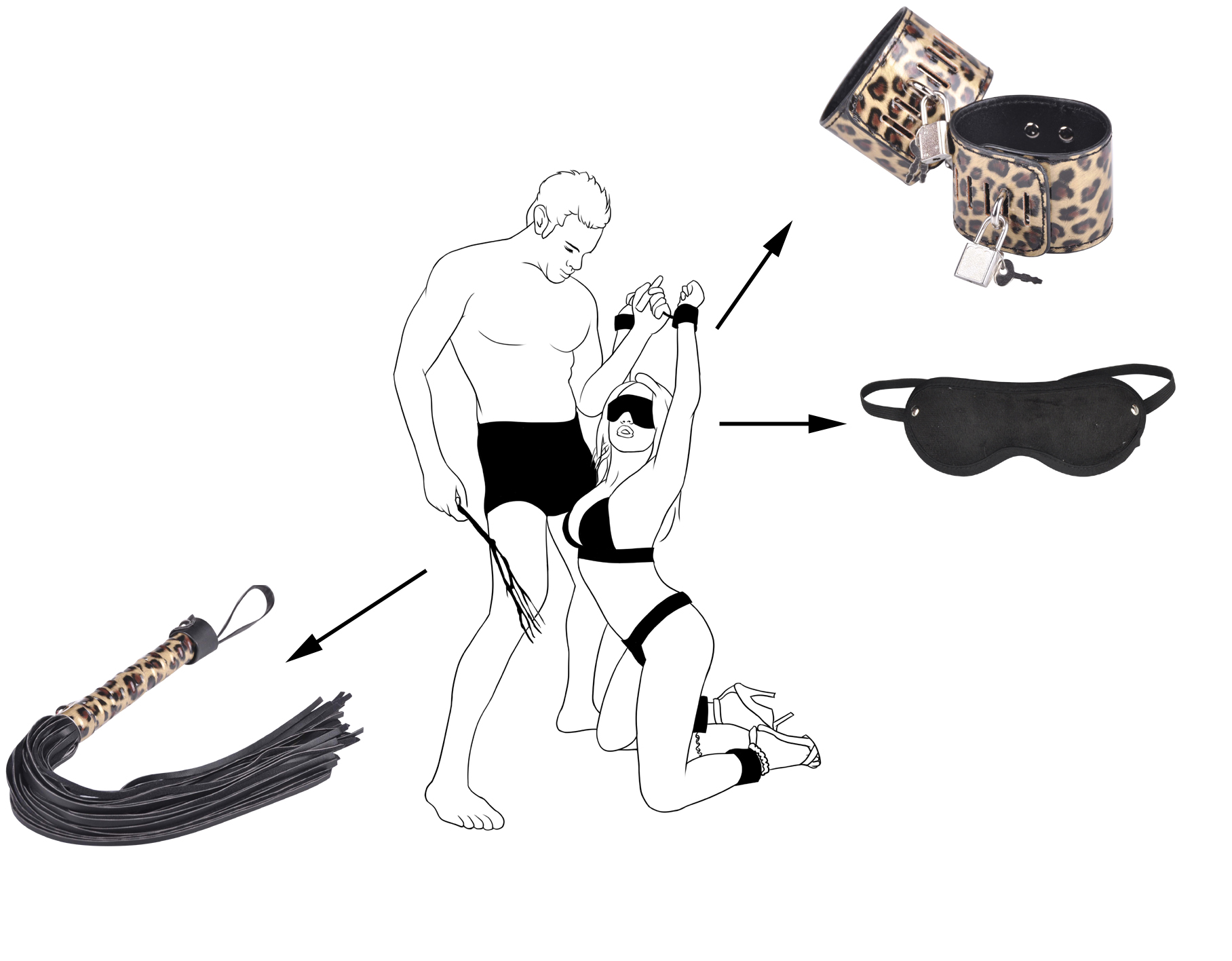 Комплектация: наручники, поножи, ошейник с поводком, кляп-шар на ремешке, маска на глаза, перьевой тиклер, плеть флоггер, бандажная верёвка, зажимы для сосков с бубенчиками, бандажный крест.