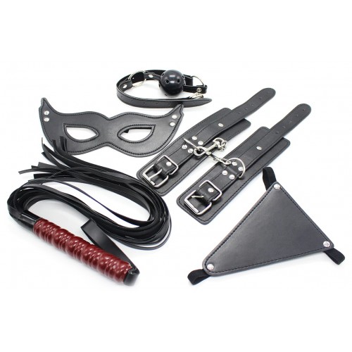 Комплектация: наручники, плеть, маска для глаз, трусики и кляп.