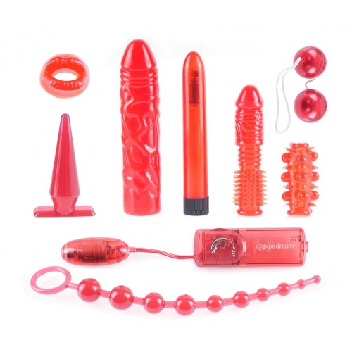 Комплектация: пластиковое вибро-яичко на выносном пульте, анальная конусовидная пробка (длина 10 см, диаметр от 1 см до 3 см), две рельефные насадки на пенис - одна с закрытой головкой, другая с открытой. Также в наборе колечко на пенис в форме губок, фаллоимитатор с насадкой (длина 19 см, диаметр 4,5 см, насадка имеет выпуклые вены по всей длине), гладкий прозрачный пластиковый вибратор (длина 15,5 см, диаметр 2,5 см, работает от двух батареек типа АА), мягкие вагинальные шарики с металлическими шариками внутри (диаметр шариков 3,5 см, вес шариков 61 грамм), анальная цепочка с кольцом из 10 звеньев (длина 28 см, диаметр от 1 см до 2,5 см).