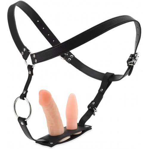 Черный ремень для страпона из искусственной кожи с двумя втулками - анальной и вагинальной.