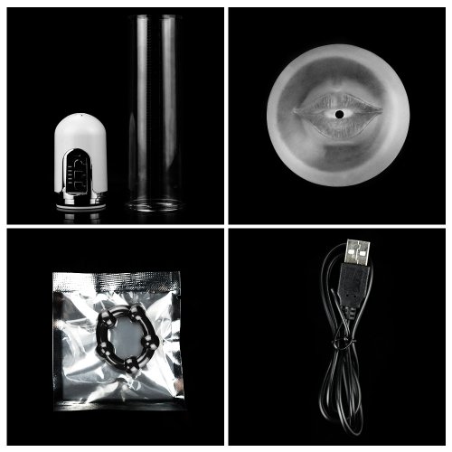 Комплектация: помпа, microUSB/USB кабель, насадка в форме вагины из ТПЭ, эрекционное кольцо из силикона.