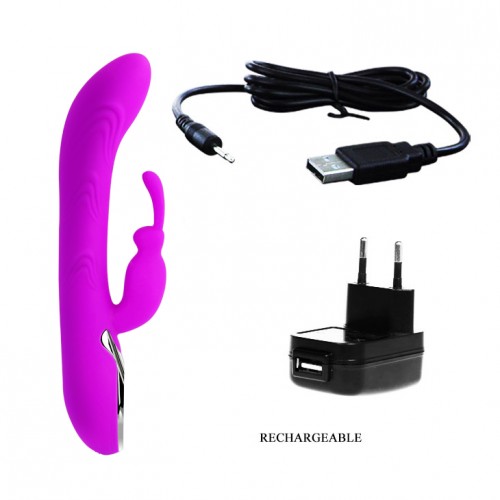 Перезаряжаемый вибро-массажёр Pretty Love Smart имеет 10 различных режимов вибраций и три точки вибростимуляции, которые переключаются сенсорными кнопкапи в основании вибратора. Изогнутая форма позволяет стимулировать точку-G, а отросток в форме зайчика порадует непревзойдённой стимуляцией клитора.