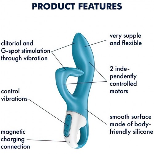 Satisfyer Embrace Me - это вибратор-кролик с 2 мощными моторчиками, которые одновременно стимулируют зону G и клитор. Имеет 12 режимов вибрации в каждом моторе, которые легко переключаются с помощью кнопок в основании вибратора. Режимы можно комбинировать между собой или управлять ими по отдельности. Основная часть имеет слегка загнутую форму и хорошо гнется, что позволяет эффективно стимулировать зону G.