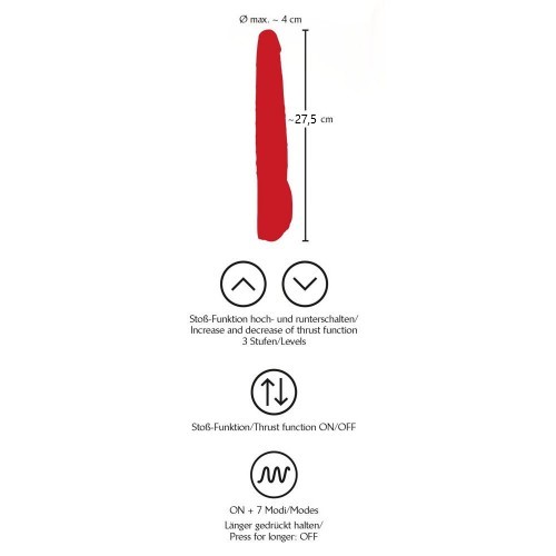 При этом каждый из режимов регулируется отдельно. Ярко-красный ствол игрушки имеет внушительные размеры и заметный рельеф, что открывает еще больше возможностей для стимуляции эрогенных зон.