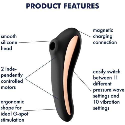 Satisfyer Dual Kiss будет баловать Вас 110 комбинациями под любое настроение! Стимулятор имеет два мощных моторчика, которые работают почти бесшумно.