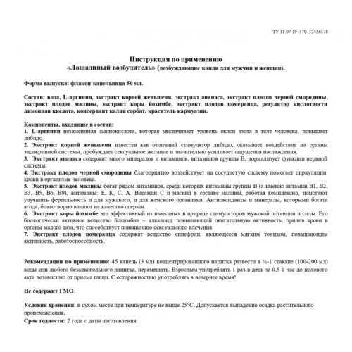 Рекомендации по применению: 45 капель (3 мл) концентрированного напитка развести в 100-200 мл воды или любого безалкогольного напитка, перемешать. Взрослым употреблять 1 раз в день за 0,5-1 час до полового акта независимо от приема пищи. С осторожностью употреблять в вечернее время!