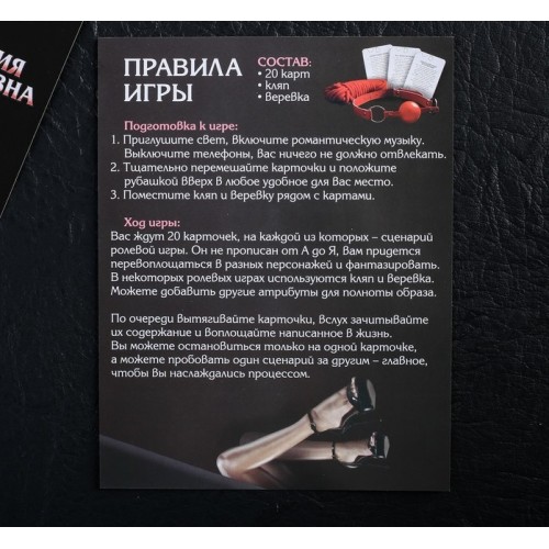 Любите ролевые игры? Кем вы хотите быть сегодня — госпожой и рабом или тайным агентом и его подружкой? В этой игре вас ждёт 20 волнующих сценариев, каждый из которых способен доставить невероятное удовольствие. А пикантный реквизит — верёвка и кляп — станет отличным дополнением!