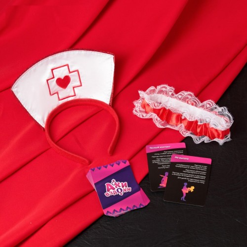 Внутри вас ждут 10 карточек с горячими эротическими позами. Изучите карточки, выберите, какие позы будете использовать сегодня, и воплотите написанное в жизнь. Партнёрша может надеть ободок медсестры и подвязку, чтобы добавить образу перчинки.