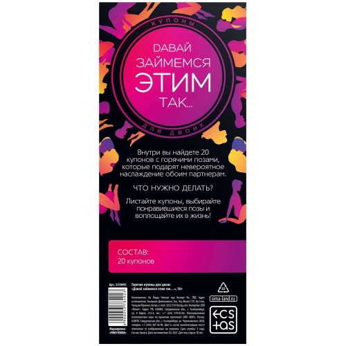 Как использовать купоны? На одной странице вас ждет иллюстрация позы, на другой – ее описание. Поэтому просто листайте страницы, выбирайте понравившиеся позиции и воплощайте их в жизнь!
