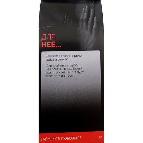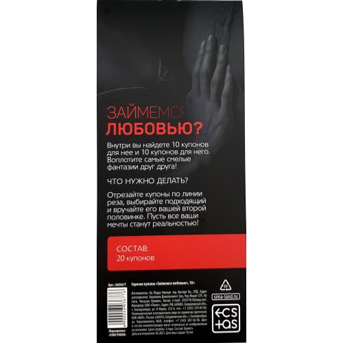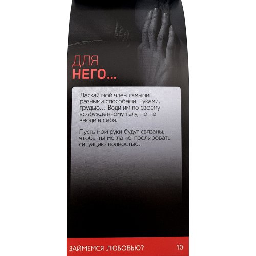Каждый купон этого набора — откровенная сексуальная фантазия. Правила просты: отрывайте понравившийся листочек и вручайте его своему партнёру. Теперь все ваши задумки воплотятся в реальность!