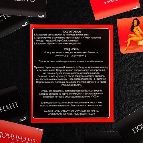Разрежьте карточки по пунктирным линиям и сформируйте 2 колоды: «Место» и «Поза». Карточки «Доминант» положите отдельно. Мужчина берет карточки «Доминант» в обе руки и прячет их за спину. Девушке нужно выбрать одну из карт — это определит, кто сегодня будет подчиняться, а кто — подчинять.