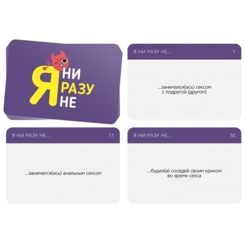 Тебя ждет 50 карточек с утверждениями, каждое из которых начинается с фразы: «Я ни разу не…» Игроки вытягивают их по одной и зачитывают. А каждый, кто хоть раз совершал указанное действие, должен выполнить наказание, а какое именно – решает ваша компания!