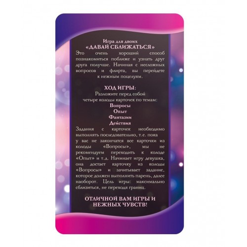 В набор входят: 10 карт «Вопросы»; 10 карт «Опыт»; 10 карт «Действия»; 10 карт «Фантазии»; правила. Сближайтесь и наслаждайтесь!