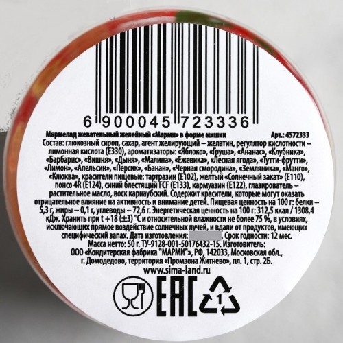 Состав: глюкозный сироп, сахар, агент желирующий: желатин, регулятор кислотности: лимонная кислота (Е330), ароматизаторы: яблоко, груша, ананас, клубника, барбарис, вишня, дыня, малина, ежевика, лесная ягода, тутти-фрутти, лимон, апельсин, персик, банан, черная смородина, земляника, манго, клюква, красители пищевые: синий блестящий FCF(Е133), желтый "Солнечный закат" (Е110), диоксид титана (Е171), понсо 4R (Е124), тартразин (Е102), глазирователь: растительное масло, карнаубский воск.