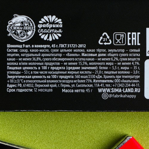 Состав: сахар, какао-масло, сухое цельное молоко, какао тертое, эмульгатор соевый лецитин, натуральный ароматизатор ванилин.